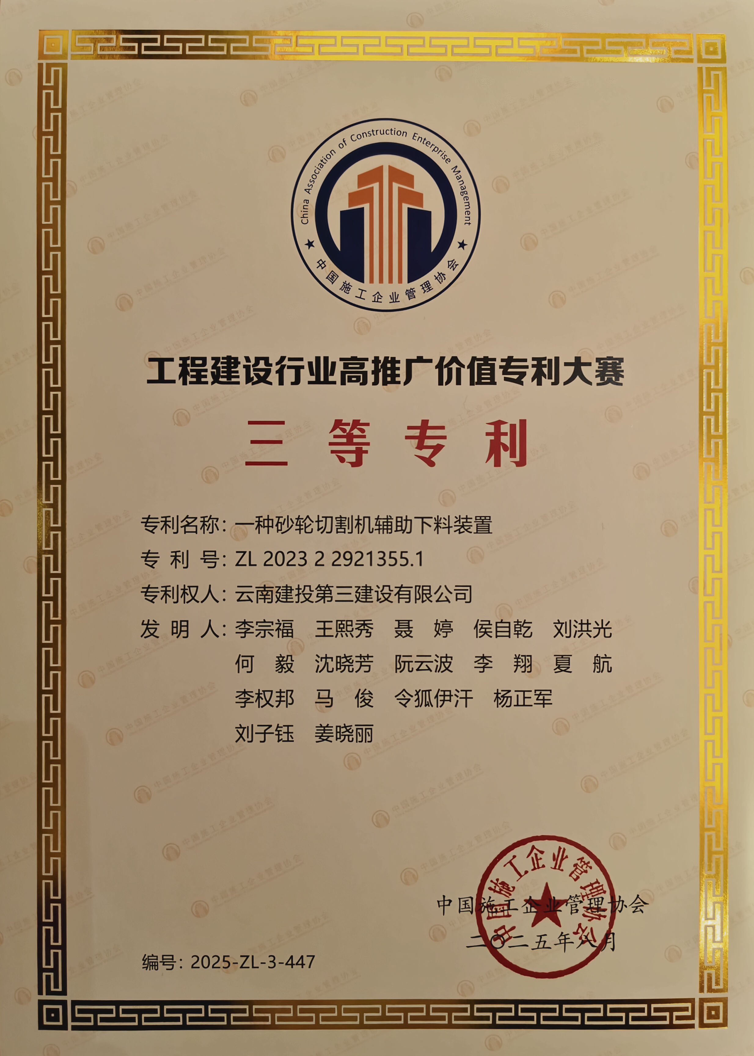 近日,第七屆工程建設(shè)行業(yè)科技創(chuàng)新大會在江蘇常州召開,公司研發(fā)的“一種砂輪切割機(jī)輔助下料裝置”(專利號:ZL202322921355.1)在工程建設(shè)行業(yè)高推廣價值專利大賽中斬獲三等專利,這是公司首次在該賽事中獲獎。