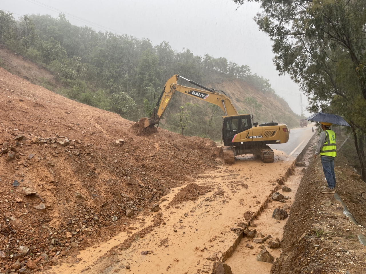 險情就是命令,元大高速土建4-1分部聞訊而動,6名一線人員火速奔赴現(xiàn)場,迅速查看險情,為后續(xù)搶險工作提供準(zhǔn)確信息。緊接著,調(diào)集挖掘機、裝載機、渣土車等大型機械設(shè)備到位,一場與時間賽跑、與風(fēng)雨抗?fàn)幍膿岆U作業(yè)隨即展開。