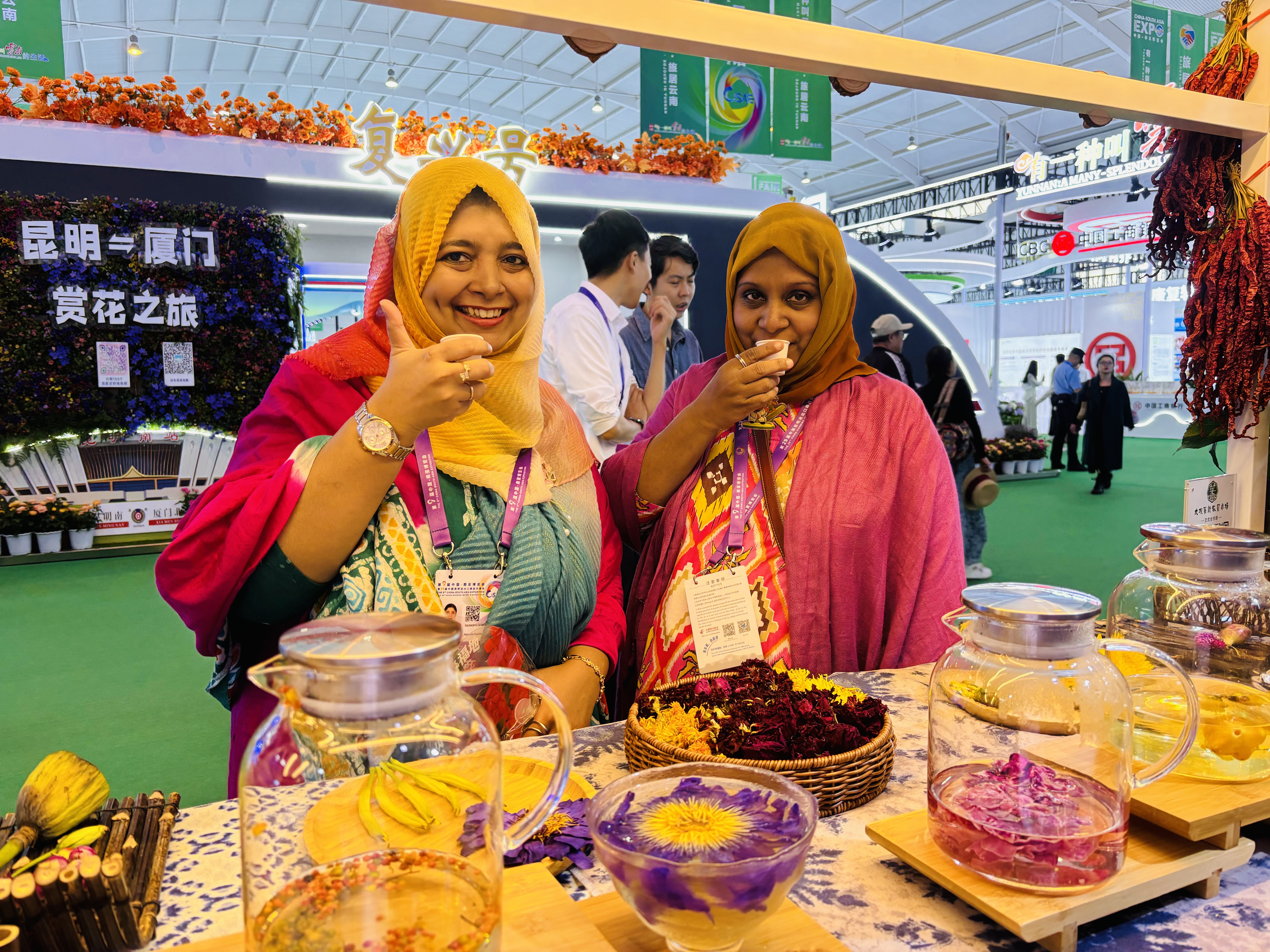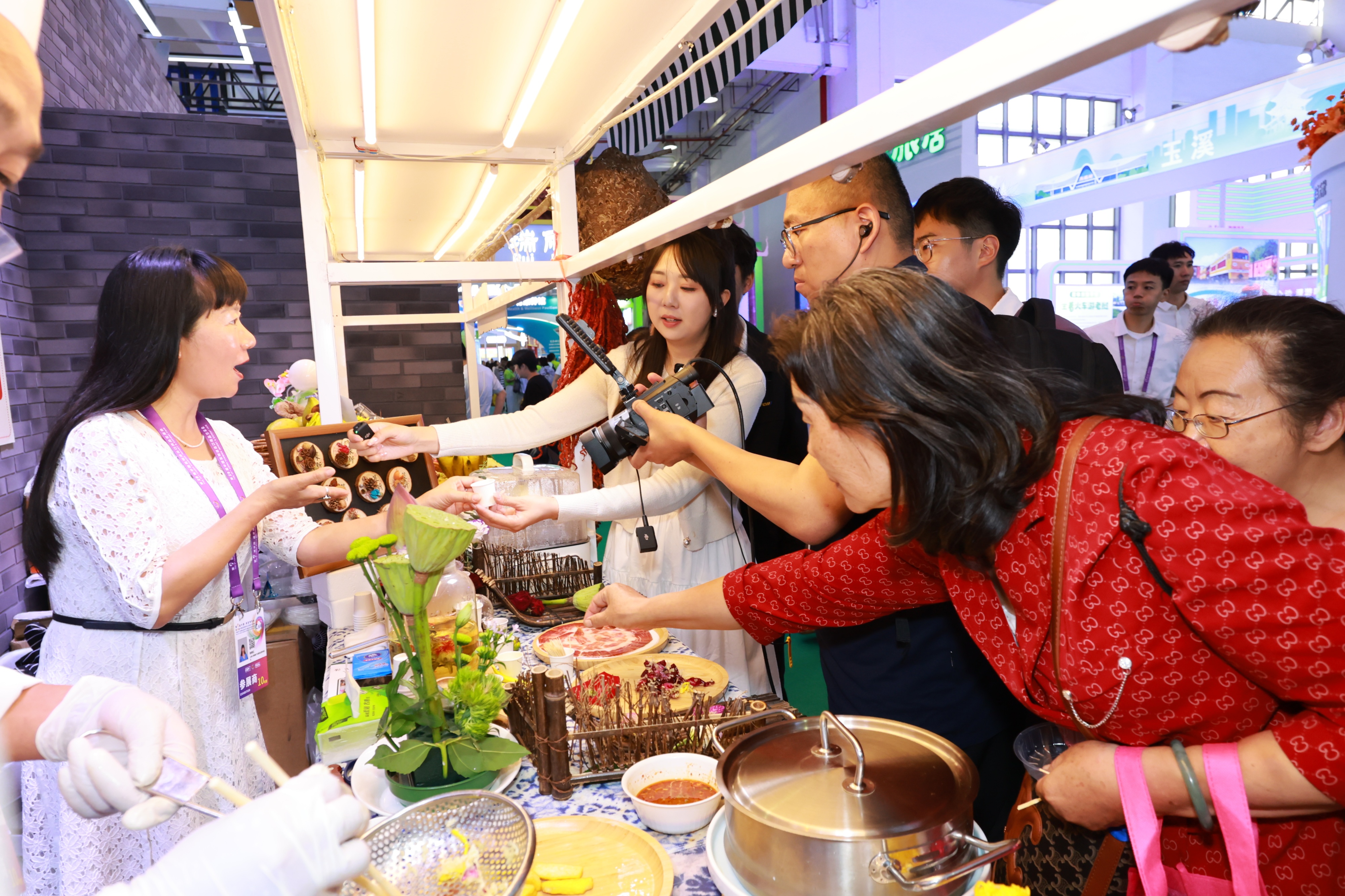 五彩斑斕的云南野菜、野花、野生菌琳瑯滿目,宛如大自然的調(diào)色盤在此鋪陳開來。鮮香撲鼻的涼拌見手青、花椒雞、粉蒸肉、炸鮮花、炸洋芋、炸豆腐等地道小吃現(xiàn)場(chǎng)制作,供大家免費(fèi)品嘗,引得觀眾們食指大動(dòng);花香馥郁、色彩斑斕、養(yǎng)眼潤心的花茶免費(fèi)試喝,更是讓人沉醉其中。這些元素相互交織,構(gòu)成了一幅充滿云南特色的煙火畫卷,吸引眾多觀眾駐足圍觀、排隊(duì)打卡,展臺(tái)前人流絡(luò)繹不絕,熱鬧非凡。