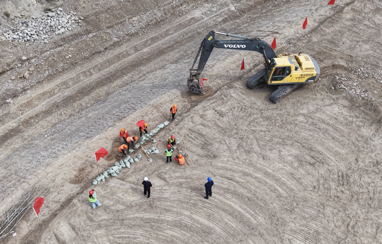 應(yīng)急演練模擬龍宮河上游遭受強暴雨,洪水向龍宮河施工區(qū)域奔流而來,情況十分緊急。接到預(yù)警,項目部立即啟動應(yīng)急預(yù)案,組織水位觀察組、應(yīng)急疏散組、搶險組、物資保障組、醫(yī)療救援組等相關(guān)小組立即響應(yīng),在最短時間內(nèi)將人員、機具快速撤離,過程中同步開展受傷人員急救及作業(yè)區(qū)域防護(hù)加固模擬演練。