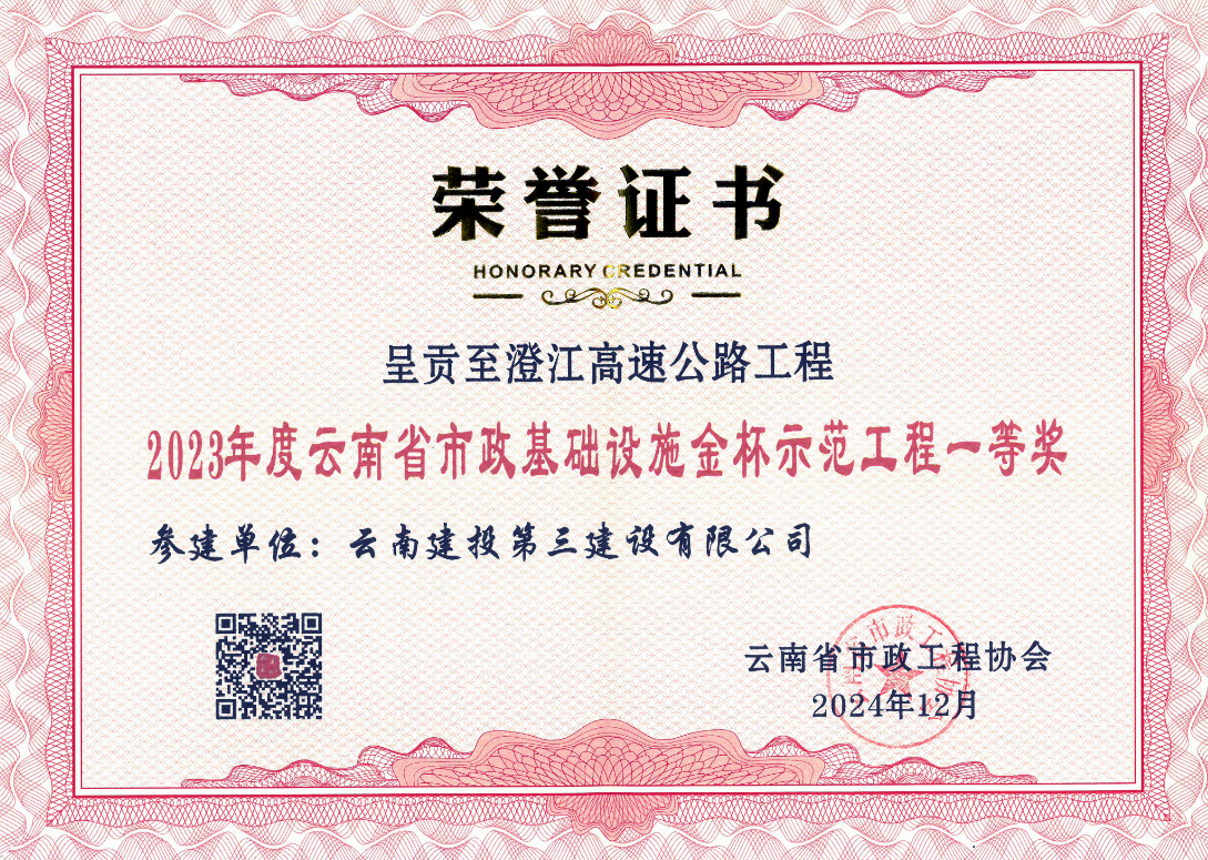 近日,云南省市政工程協(xié)會七屆三次會員大會暨云南省市政行業(yè)高質(zhì)量發(fā)展論壇在昆明召開,由路橋市政直管一部承建的呈貢至澄江高速公路工程項目榮獲2023年度云南省市政基礎(chǔ)設(shè)施金杯示范工程一等獎。
