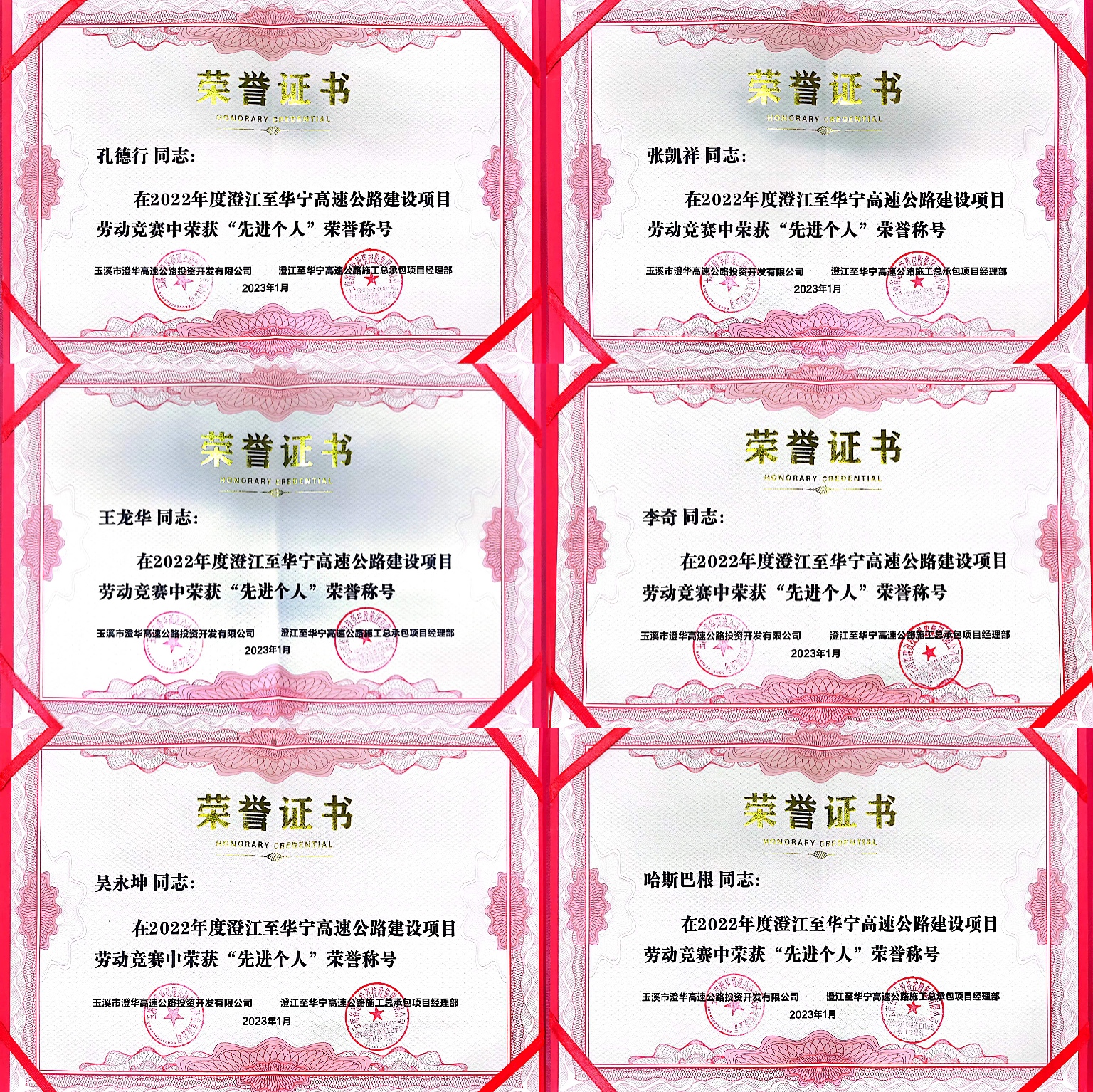 近日,由公司第五直管項(xiàng)目部承建的澄華高速土建九、十分部項(xiàng)目在云南省澄江至華寧高速公路項(xiàng)目“能通全通”“互聯(lián)互通”工程勞動(dòng)競(jìng)賽中榮獲“先進(jìn)集體”榮譽(yù)稱(chēng)號(hào),項(xiàng)目管理人員“孔德行、李奇、張凱祥、哈斯巴根、吳永坤、王龍華”6人榮獲“先進(jìn)個(gè)人”稱(chēng)號(hào)。