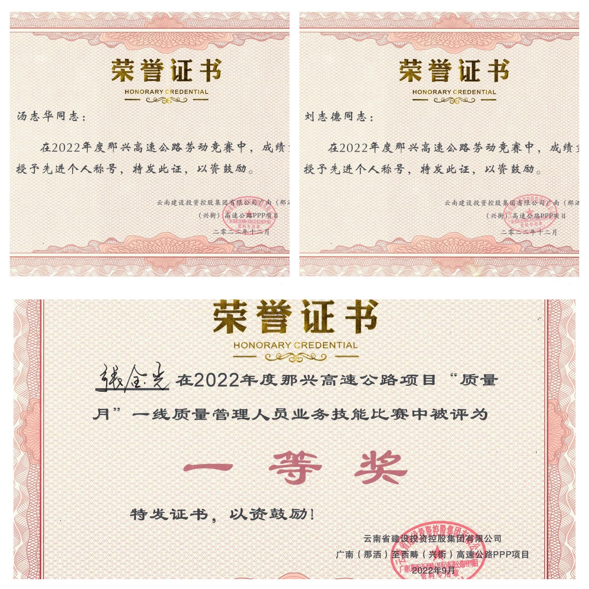 近日,在文山廣興高速公路投資建設(shè)開發(fā)有限公司召開的“2022年工作總結(jié)及先進表彰大會”上,由公司路橋市政直管三部承建的那興高速公路土建六分部項目經(jīng)理部獲得“優(yōu)秀安全管理團隊”稱號,獲得項目公司50000元人民幣的獎勵。同時,項目副總工湯志華、安全總監(jiān)劉志德在2022年那興高速“能通全通”“互聯(lián)互通”工程勞動競賽中獲得“先進個人”稱號。另外項目總工張金光在“質(zhì)量月”一線管理人員業(yè)務(wù)技能比賽中獲全線一等獎。