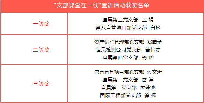 此項(xiàng)活動從4月底持續(xù)到6月中旬,共有29家黨支部參加。公司領(lǐng)導(dǎo)、現(xiàn)場聽眾、黨委工作部人員從形象風(fēng)度、語言表達(dá)、主題內(nèi)容、綜合印象、宣講時(shí)長等方面綜合評審,最終評出一等獎(jiǎng)2名,二等獎(jiǎng)3名,三等獎(jiǎng)4名,并于7月1日在“奮進(jìn)新時(shí)代 獻(xiàn)禮二十大”慶“七一”主題黨日活動中對獲獎(jiǎng)的黨支部書記進(jìn)行表彰。