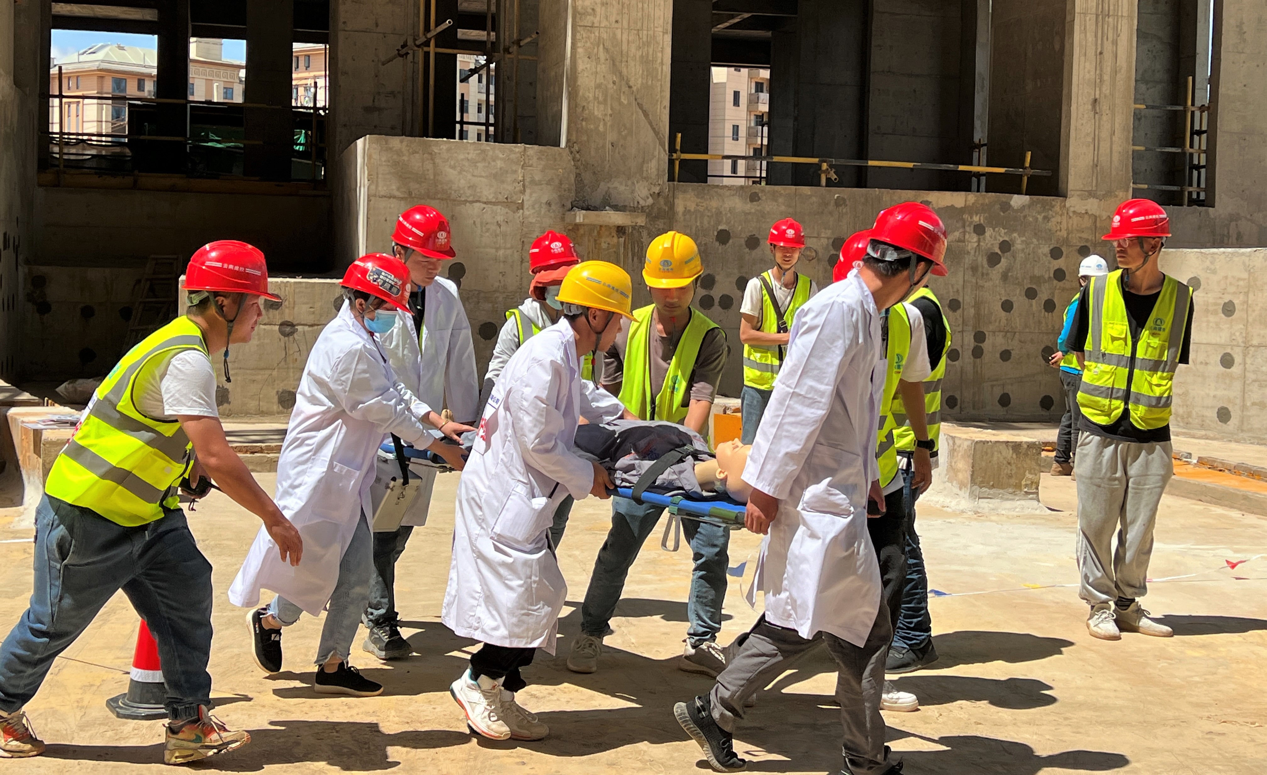 本次演練分為應急搶險組、醫療救護組、物資保障組、事故調查組等8個小組,施工人員私自翻越欄桿作業,導致高處墜落,現場人員發現之后,立即報告項目負責人,由項目負責人向公司報告事故并啟動應急救援預案,各小組迅速出動,應急搶險組確定事故發生地點,并拉設警戒線;技術組緊接著對事故周邊進行監測和評估,確認事故現場沒有二次傷害風險;醫療救護組攜帶醫用急救箱、擔架進入現場,對傷員進行初步檢查,對傷者傷勢進行初步判斷,發現傷者意識模糊,身體多處受損,在進行心肺復蘇和人工呼吸后,傷者意識稍微清醒,醫護人員進行簡單處理后,迅速聯系救護車將其送往醫院進一步檢查治療。各小組陸續撤離現場,相關小組成員在事故現場設置警戒線,等待繼續查明事故原因、確定事故性質和責任等工作。至此,應急演練圓滿結束。