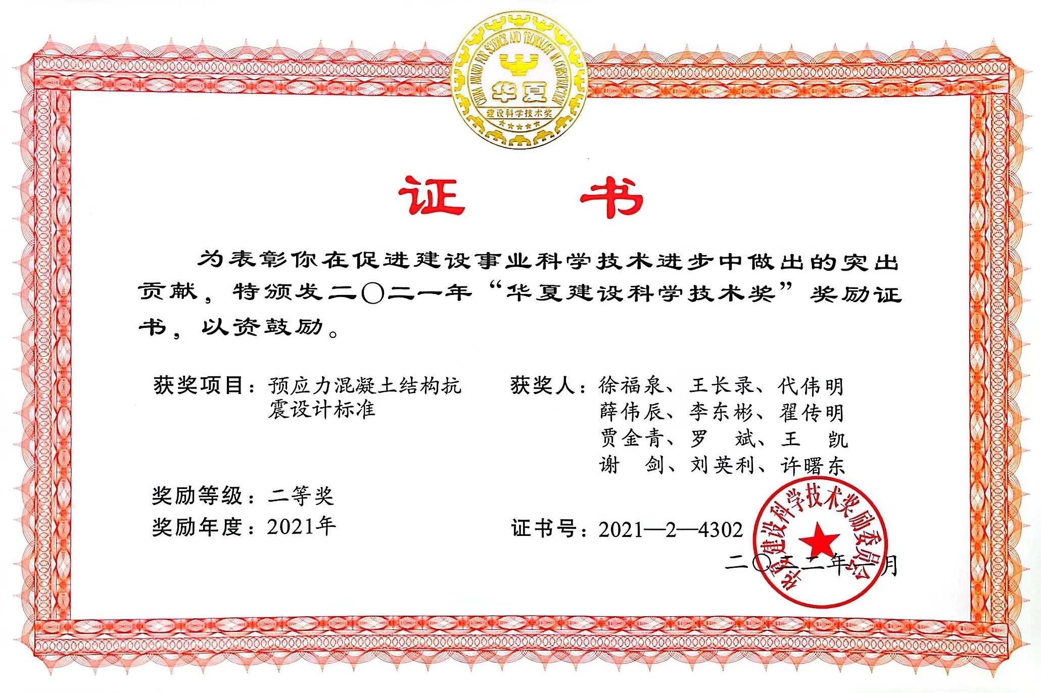 近日,由公司與中國(guó)建筑科學(xué)研究院共同主編的《預(yù)應(yīng)力混凝土結(jié)構(gòu)抗震設(shè)計(jì)標(biāo)準(zhǔn)》JGJ/T40-2019榮獲2021年度“華夏建設(shè)科學(xué)技術(shù)獎(jiǎng)”二等獎(jiǎng)。