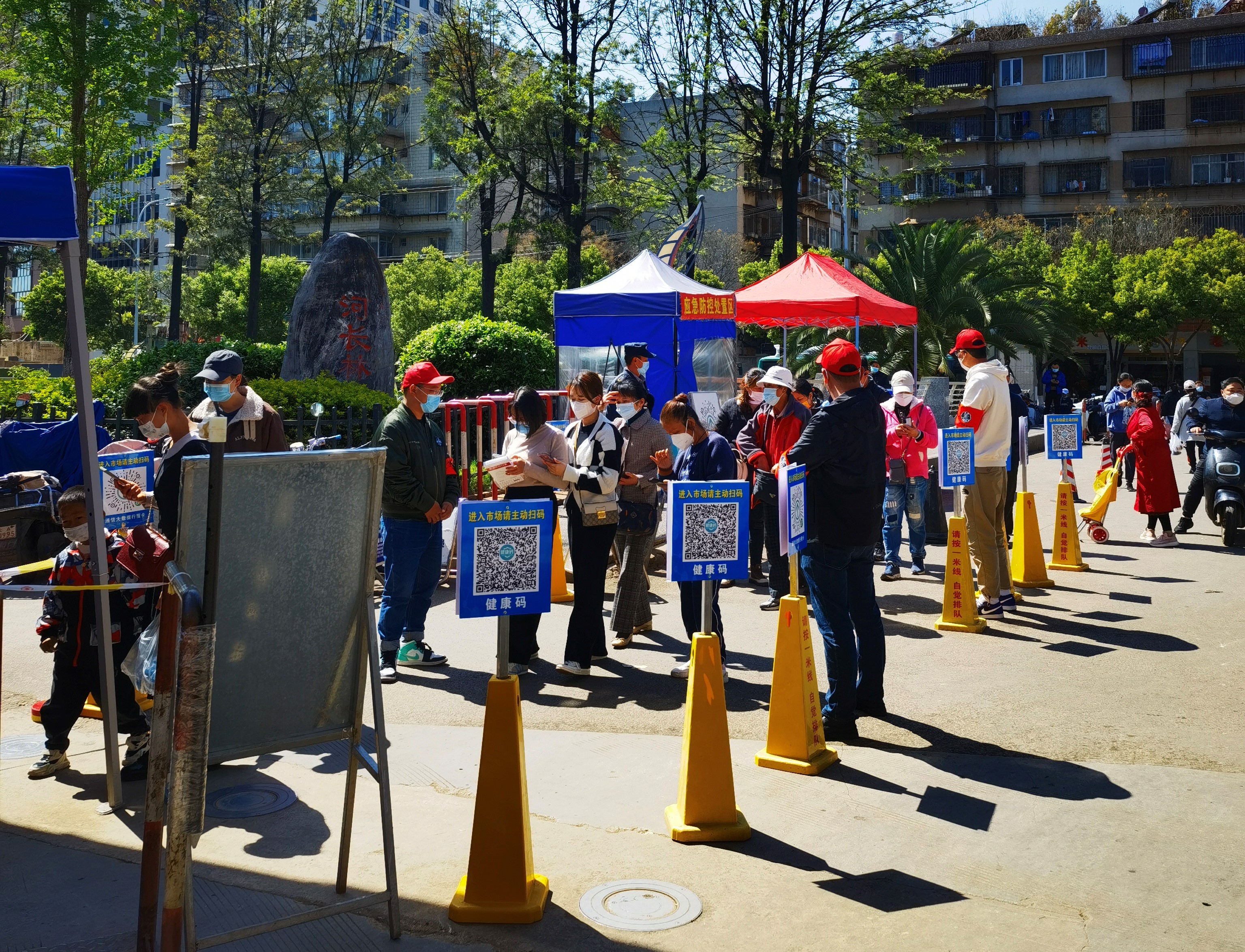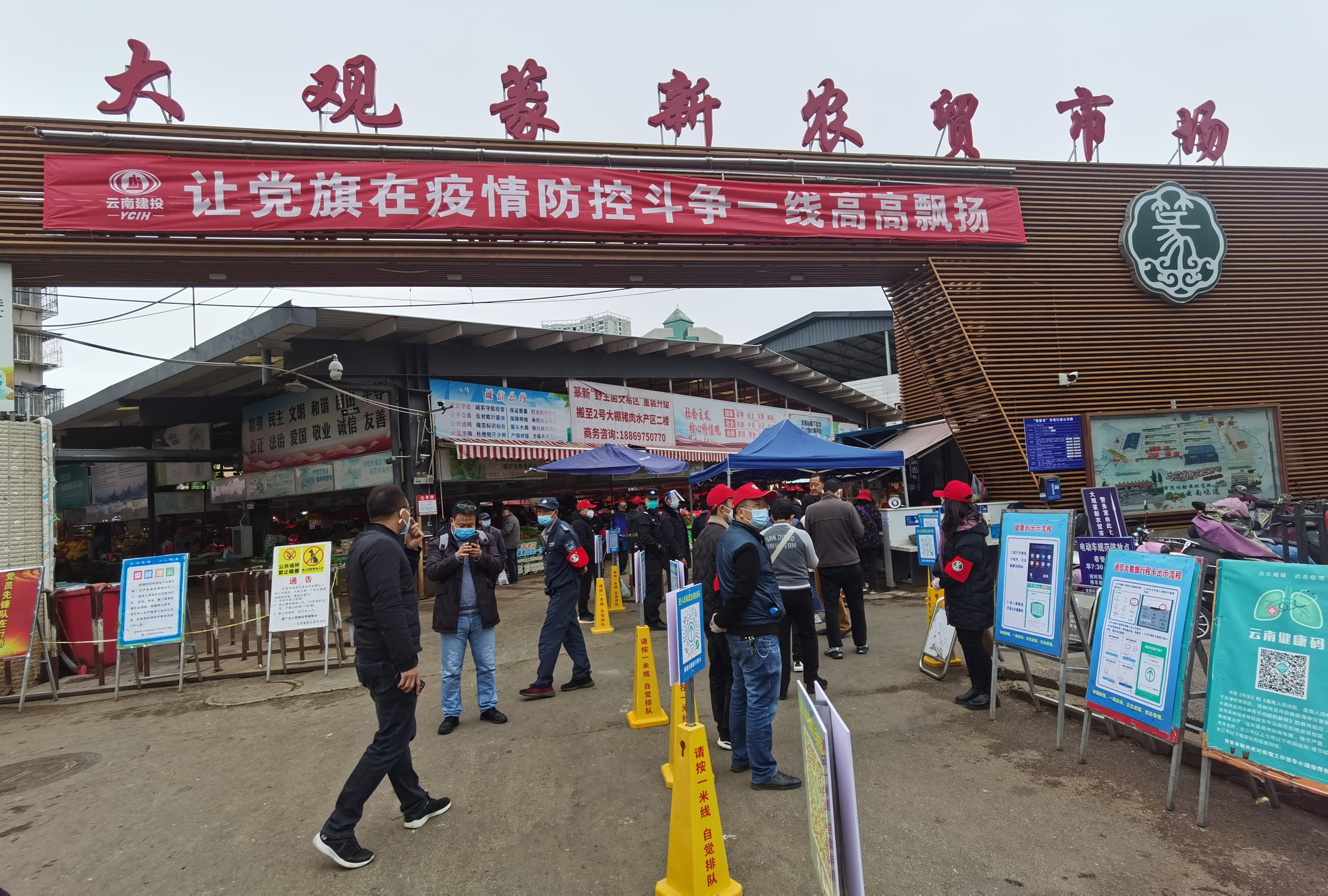 公司黨委結(jié)合市場實(shí)際情況,將黨員先鋒隊(duì)劃分為6個(gè)小組,每組10人,在劃分進(jìn)出通道的基礎(chǔ)上,于入口處拉好警戒線設(shè)立三或四個(gè)通道,會(huì)同原有的市場安保和管理人員,分段式檢查所有進(jìn)入市場的人員的健康碼和行程碼,行程碼帶星號(hào)、健康碼非綠色的人員一律禁止進(jìn)入市場,對(duì)沒有手機(jī)的人員進(jìn)行登記,并確保身份證號(hào)等相關(guān)信息齊全方可允許進(jìn)入市場。