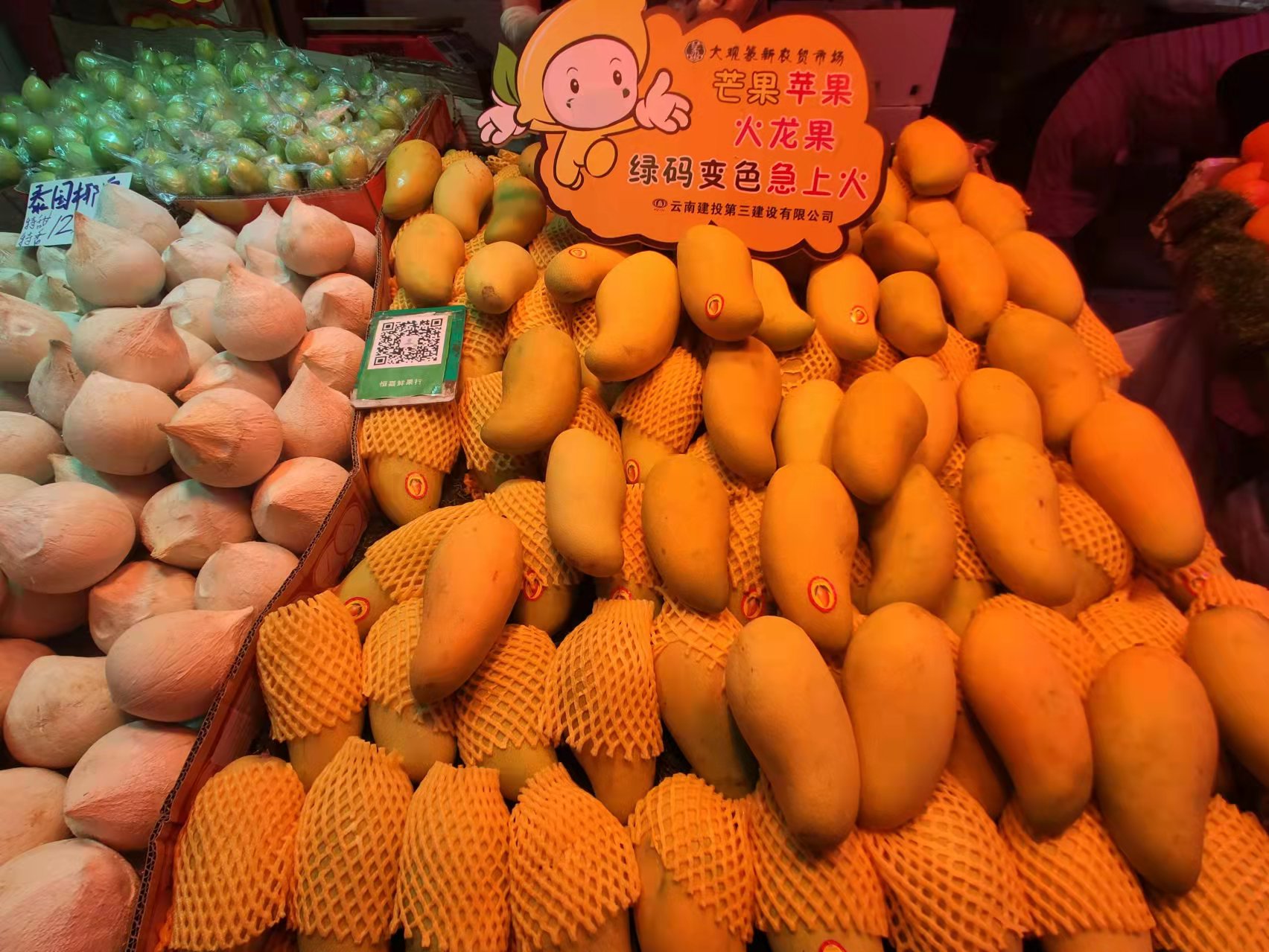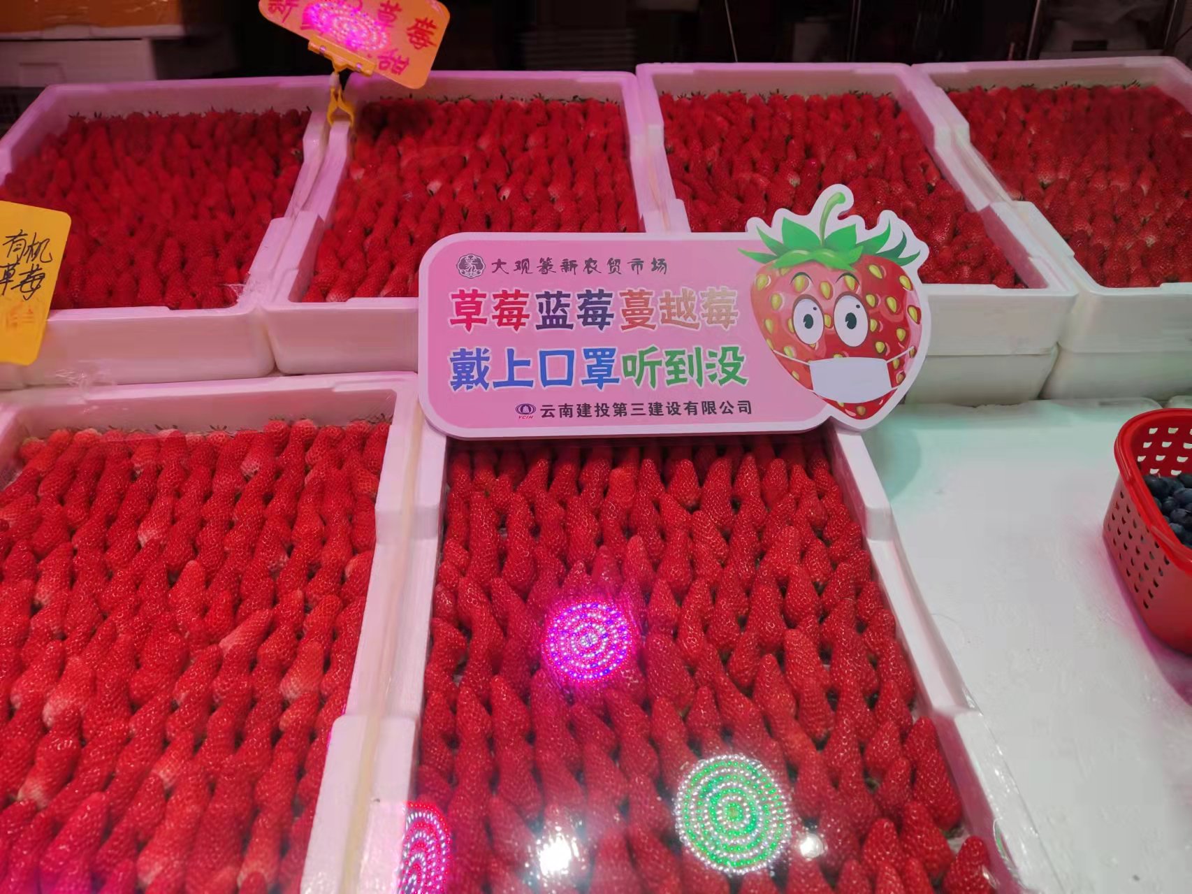 為時(shí)刻提醒大家佩戴口罩,做好防護(hù)個(gè)人防護(hù),大觀篆新農(nóng)貿(mào)市場緊跟新潮流風(fēng)向標(biāo),根據(jù)不同的售賣商品制作各種Q趣可愛的萌語標(biāo)牌,水果攤上“草莓藍(lán)莓蔓越莓 戴上口罩聽到?jīng)]”、“芒果蘋果火龍果 綠碼變色急上火”,蔬菜攤上“油菜韭菜大白菜 不打疫苗你最菜”,瓜果攤上“黃瓜南瓜大冬瓜 防疫到位頂呱呱”、“茄子黃瓜配青菜 戴上口罩最厲害”,肉類攤上“牛肉羊肉和豬肉 打疫苗的最優(yōu)秀”、“鹵雞醬肉小豬肘 誰沒口罩誰最丑”等。一句句朗朗上口的順口溜,配上呆萌可愛的果蔬肉蛋卡通圖像,讓人眼前一亮,下意識(shí)檢查自己口罩是否戴好。