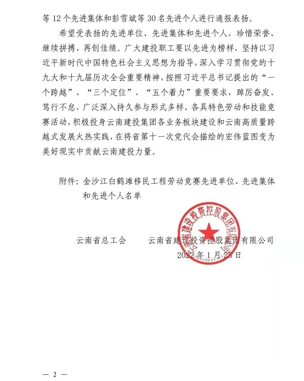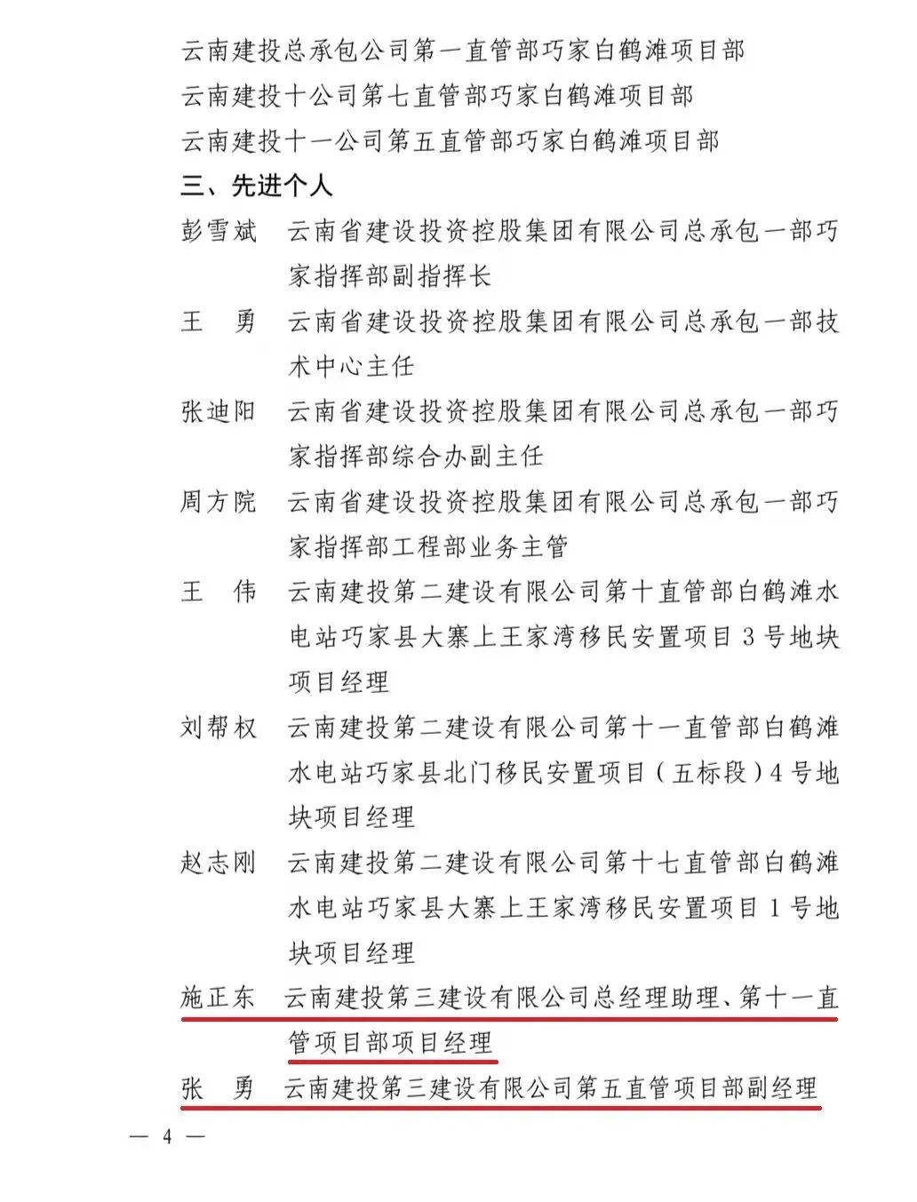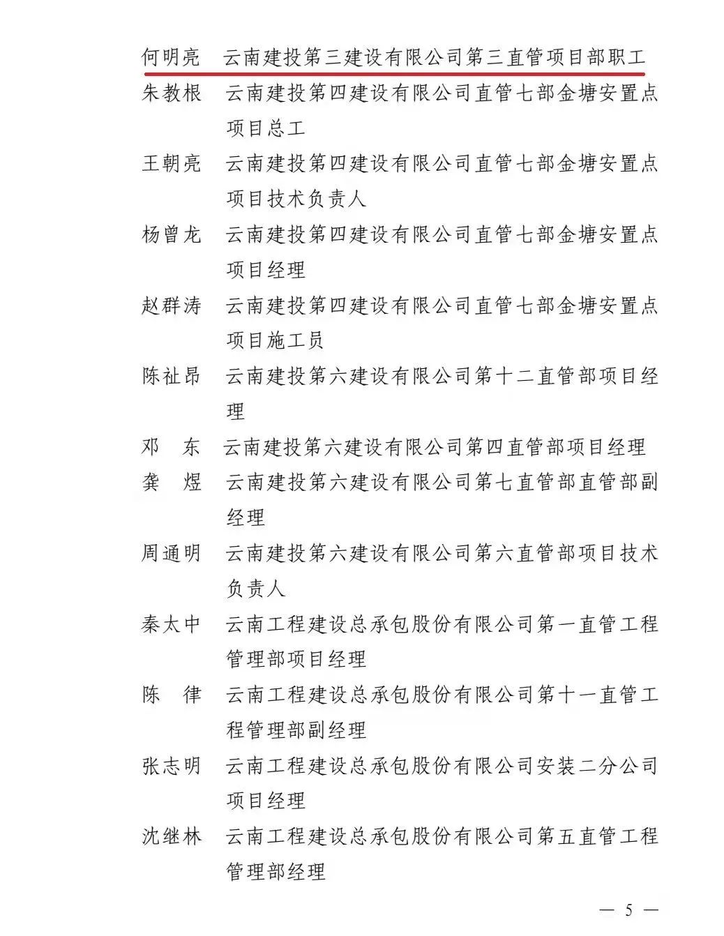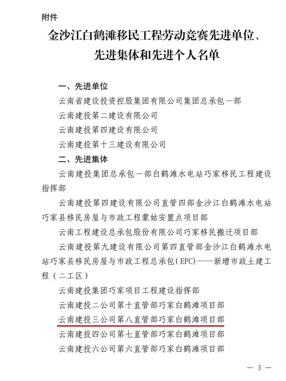近日,云南省總工會(huì)和云南省建設(shè)投資控股集團(tuán)有限公司聯(lián)合發(fā)文,通報(bào)表揚(yáng)金沙江白鶴灘移民工程勞動(dòng)競賽先進(jìn)單位、先進(jìn)集體及先進(jìn)個(gè)人。公司第八直管項(xiàng)目部榮獲先進(jìn)集體,公司總經(jīng)理助理、第十一直管項(xiàng)目部經(jīng)理施正東,第五直管項(xiàng)目部副經(jīng)理張勇以及第三直管項(xiàng)目部項(xiàng)目經(jīng)理何明亮榮獲先進(jìn)個(gè)人。