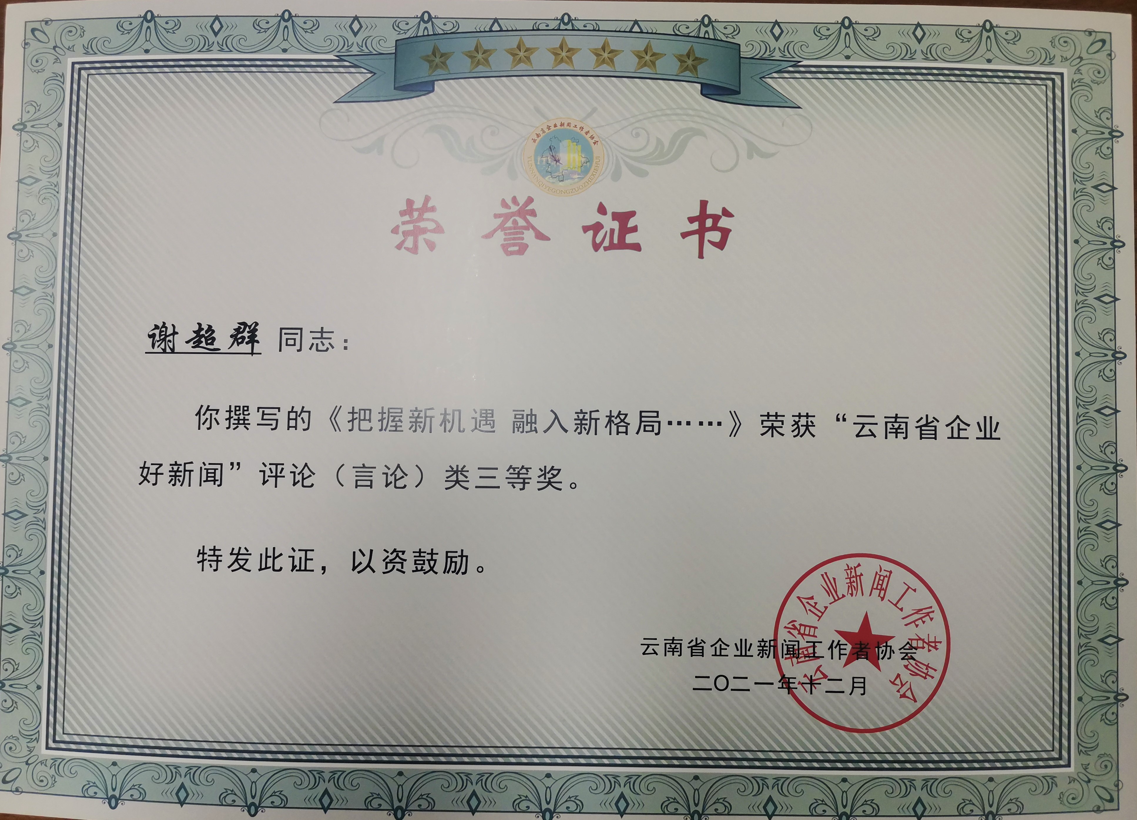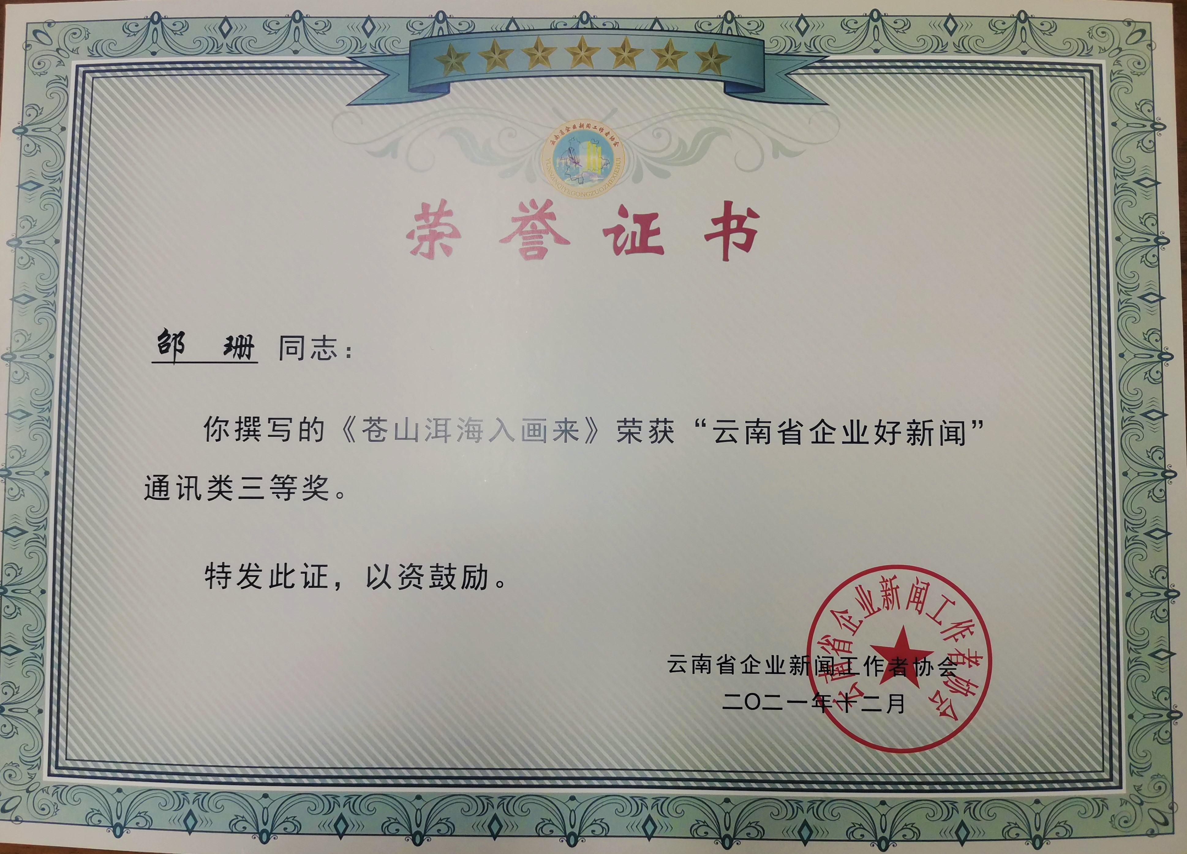 近日,云南省企業(yè)新聞工作者協(xié)會公布“2020-2021年度好新聞”評選結(jié)果,公司4名職工獲獎。其中,第三直管部黨支部書記李梟獲新媒體類二等獎,公司女工主任、第三項目部工會主席靳易賢獲新媒體類三等獎,黨委工作部職工謝超群、邵珊分別獲評論(言論)類、通訊類三等獎。