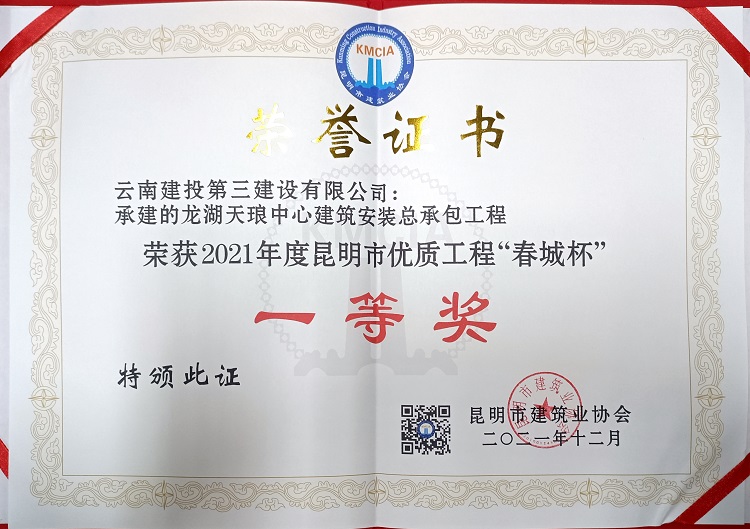 12月2日,由第一項目經理部承建的龍湖天瑯中心建筑安裝總承包工程,榮獲昆明市2021年度昆明市優(yōu)質工程“春城杯”一等獎。