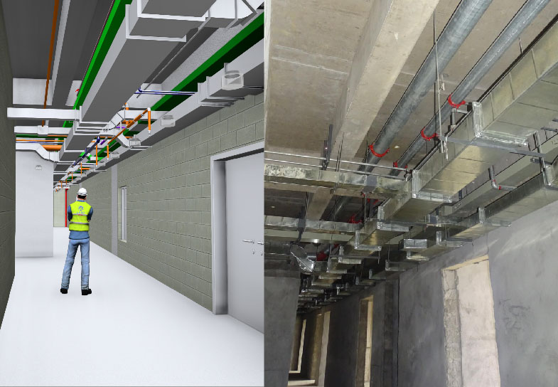 BIM負責人張猛,曾負責過公司多個重點項目機電BIM模型建設,建模經驗豐富,專業知識全面,當仁不讓扛起了重任,依照設計施工圖以及方案思路,搶在主體還沒封頂前,完成了各專業管道BIM模型繪制。當然這還沒完,還有建模最重要的一環——解決碰撞沖突,一開始檢查出759個碰撞點位,張猛先后調整了23次管道走向以及管道標高,一個星期后將“碰撞”逐一擊破,解決了所有沖突部位。三維視圖中管道整體排布效果良好,轉角交錯處無碰撞,整體效果美觀。