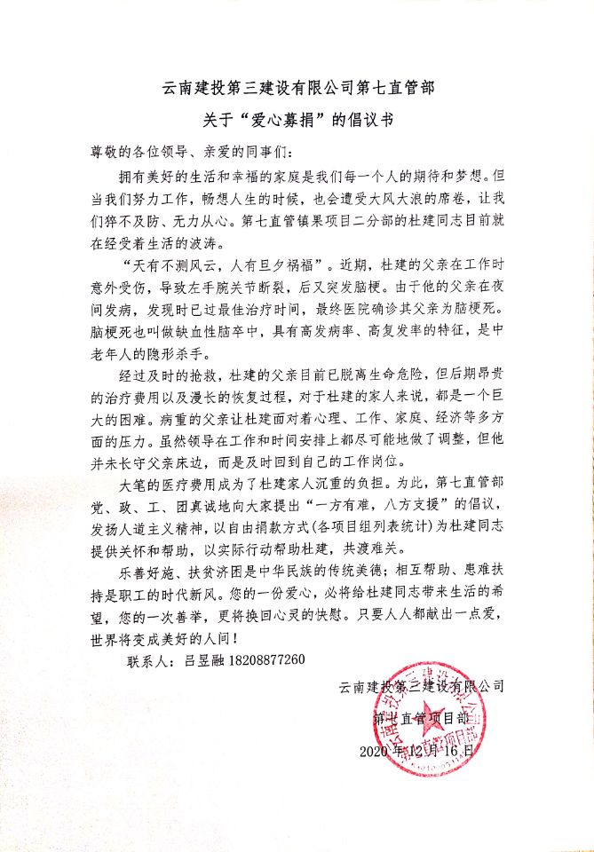一方有難,八方支援。近日,第七直管項目部組織開展“獻愛心捐款”活動,為項目職工杜建同志父親捐款25410元,幫助他們度過眼前難關,祝愿杜建父親盡快戰勝病魔、早日康復。