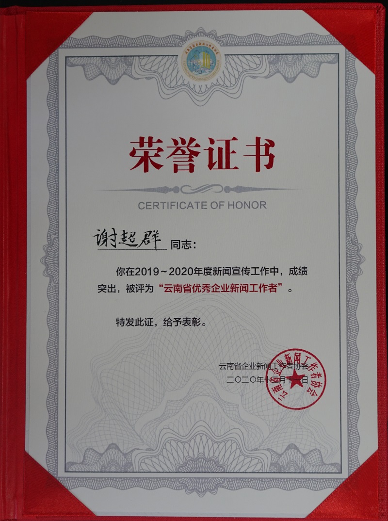 12月9日—11日,在玉溪市召開的“云南省企業新聞工作者協會2020年會暨紅塔文化講壇”中,公司微信公眾號“云南建投第三建設有限公司”榮獲“云南省優秀企業新媒體”榮譽稱號,謝超群榮獲“2019-2020年度云南省優秀企業新聞工作者”榮譽稱號。