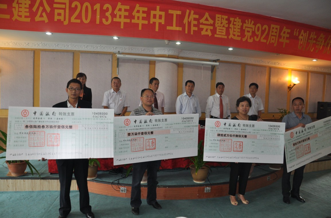 頒獎環(huán)節(jié),會議氣氛一步步推向高潮。最閃亮的就是公司為落實項目經(jīng)理責(zé)任制,進一步強化成本管理,傳遞正能量,對4個項目進行的406.23萬元的兌現(xiàn),其中:第三直管部云南興云生物科技產(chǎn)業(yè)有限公司研發(fā)中心項目補充兌現(xiàn)42.58萬元;第二直管部云南廣播電視大學(xué)呈貢校區(qū)項目兌現(xiàn)363.91萬元;第一水電項目部麗水雅苑住宅小區(qū)六標(biāo)段水電安裝項目兌現(xiàn)1.71萬元;第二水電項目部麗水雅苑住宅小區(qū)五標(biāo)段水電安裝項目兌現(xiàn)10.61萬元。當(dāng)四張現(xiàn)金支票高高舉起時,全場響起雷鳴般熱烈的掌聲。
