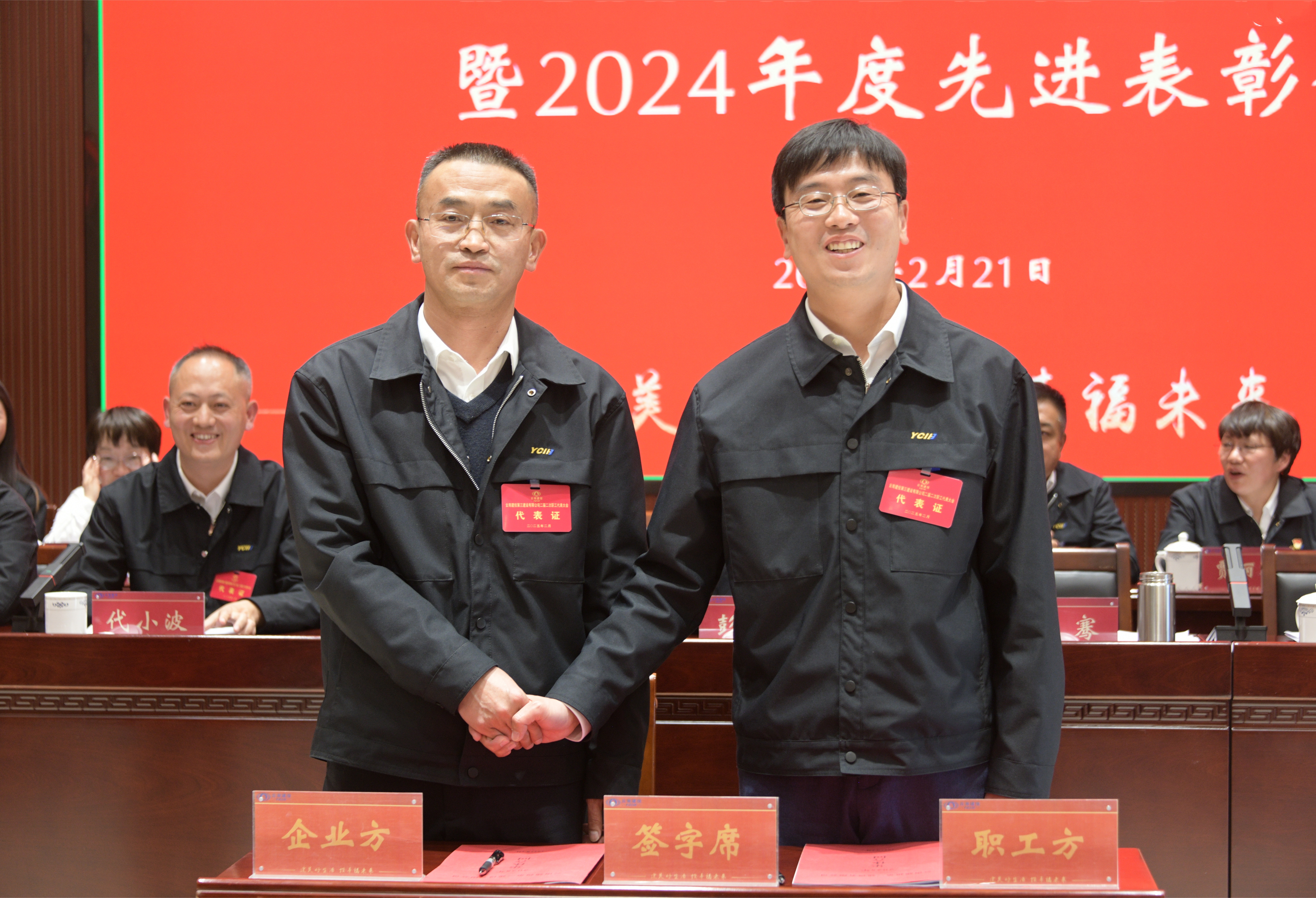 李騫與容超分別代表企業(yè)方和職工方簽訂《2025年集體合同》。