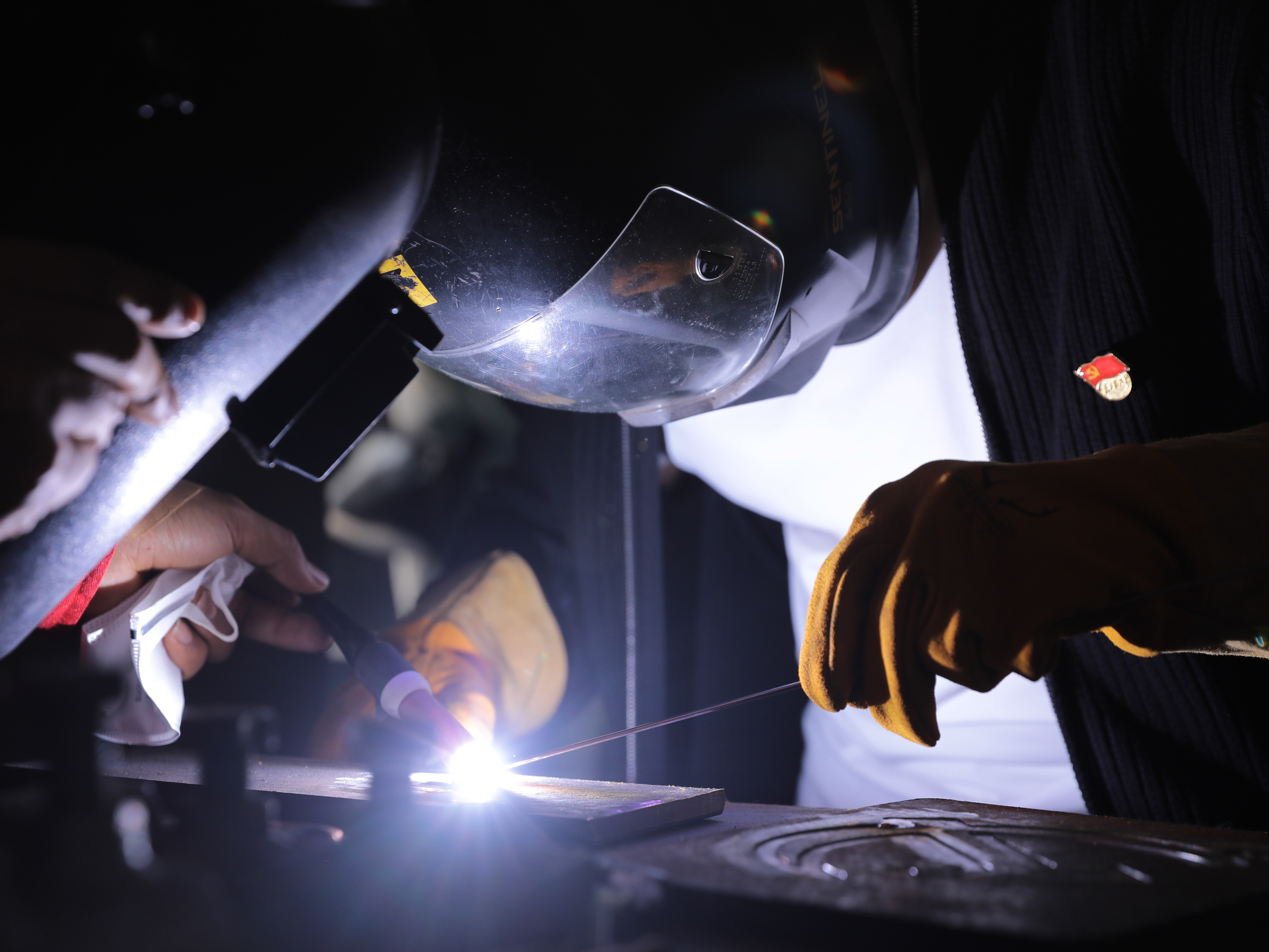 全體團員青年在講解員的帶領(lǐng)下依次參觀生產(chǎn)車間、技能大師工作室展示廳及實訓(xùn)室,了解車間主要設(shè)備、生產(chǎn)流程,感受技術(shù)工人工作場景。過程中,全國青年崗位能手馬繼良在實訓(xùn)室為大家現(xiàn)場展示焊接實操,并指導(dǎo)大家體驗焊接。